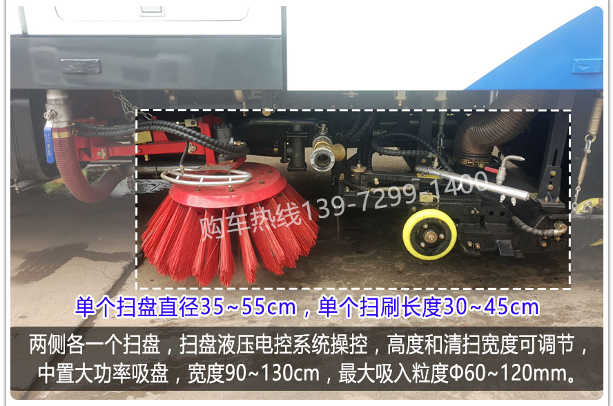 二、上裝配置: 1、帶2個中置掃盤;中置超寬吸嘴;雙層吸塵筒;康明斯170馬力副發(fā)動機(jī),3800軸距多利卡配江鈴64kW增壓副發(fā)動機(jī);臺灣液壓閥;大力馬達(dá);德國高壓水泵(前沖/側(cè)噴/中噴/后噴霧)/側(cè)沖洗水槍/垃圾箱自潔裝置);萬向高壓路沿清洗;威龍低壓泵(前沖),氣動球閥控制;4mm不銹鋼垃圾箱;不銹鋼水箱;德國控制器;尾部箭頭燈;機(jī)油、垃圾箱、水箱均帶防溢或低位報警裝置;倒車及洗掃狀態(tài)室內(nèi)監(jiān)視器;多種語音提示;倒車自動保護(hù)、防傾倒垃圾翻車保護(hù)、檢修安全保護(hù);20m高壓沖洗卷盤;刷臂轉(zhuǎn)動機(jī)構(gòu)使用德國進(jìn)口高新耐磨工程隔套